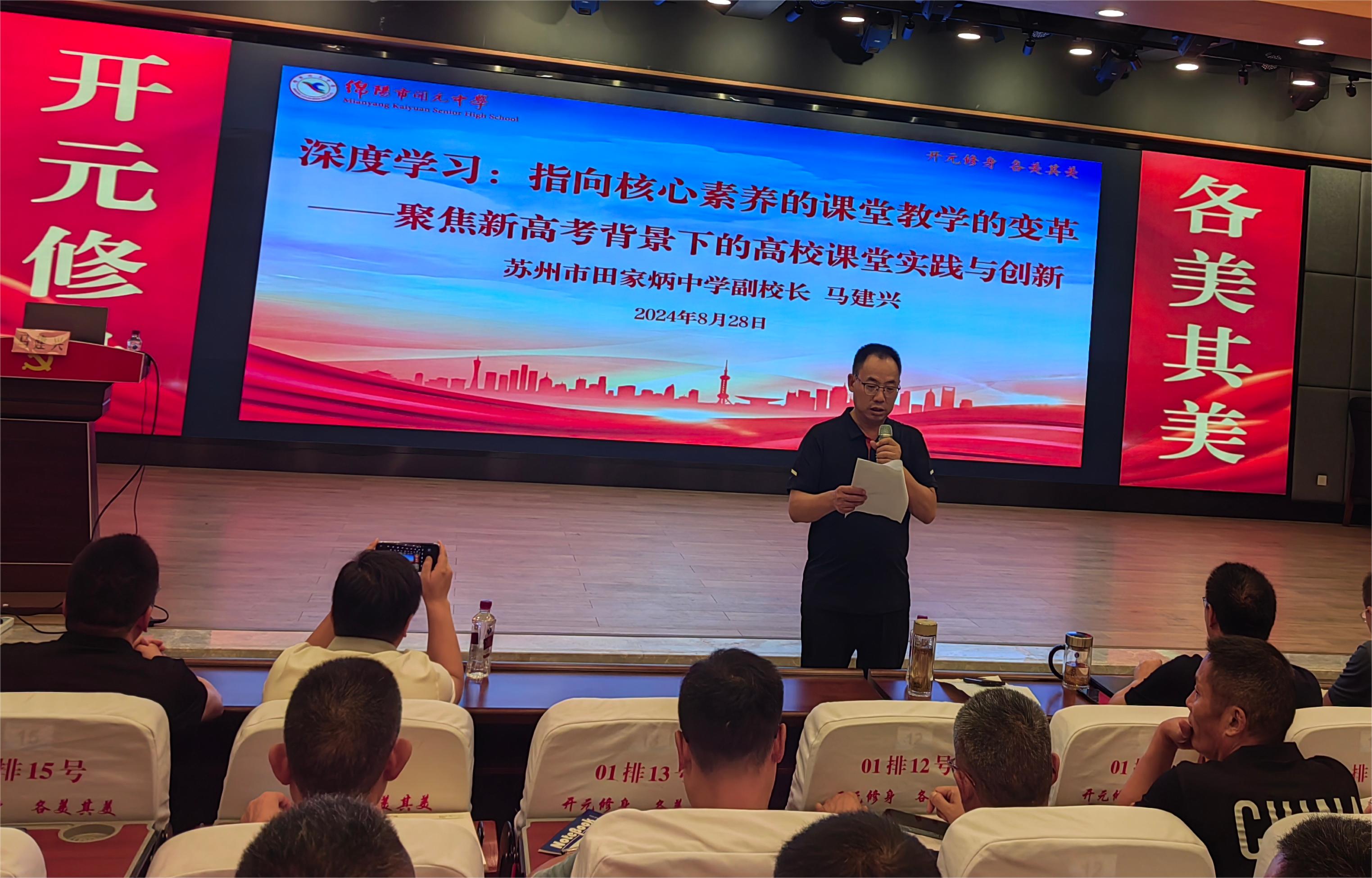 8月28日下午,綿陽市開元中學(xué)在學(xué)術(shù)報(bào)告廳舉辦了以“賦能教學(xué),奔赴新程”為主題的2024年秋教師全員培訓(xùn)活動(dòng)。本次培訓(xùn)特邀到多次參與教育部考試院、質(zhì)量監(jiān)測中心、教材局和課程教材研究所相關(guān)工作的中國教育學(xué)會“領(lǐng)航計(jì)劃”培訓(xùn)團(tuán)隊(duì)成員、首屆國家級骨干教師培訓(xùn)班學(xué)員、“國培”專家?guī)斐蓡T、江蘇省生物奧林匹克競賽高級教練、蘇州市生物學(xué)科帶頭人、蘇州田家炳中學(xué)副校長馬建興作主旨講座,講座由該校黨委副書記、校長敬正雄主持。