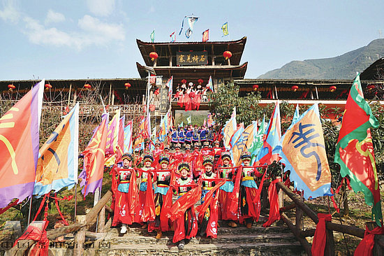游客走出車門的一刻,鑼鼓、嗩吶和羌族民歌潮水般涌來。寬闊的青石階梯天梯般直達(dá)由杉皮和松木桿搭建的寨門。階梯兩邊,身穿羌袍的羌族男女以最熱烈的大紅、桃紅和湖藍(lán)肆無忌憚地展示著自己大雅大俗之美。路行一半,熱情的主人已經(jīng)迎上來,獻(xiàn)羌紅,敬咂酒。