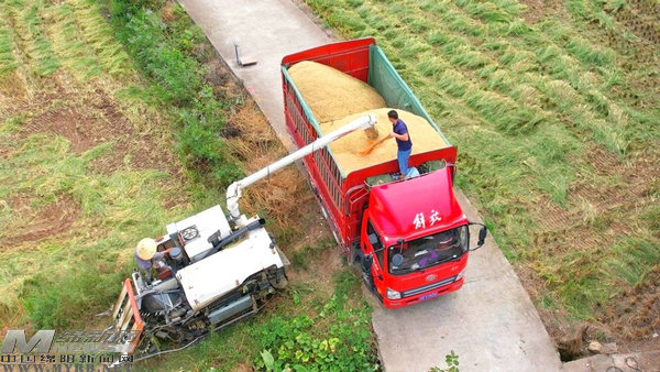 在石洞河村八組的稻田里,稻浪翻滾,機(jī)聲隆隆。工作人員熟練地駕駛著水稻收割機(jī),在黃綠交織的田間來(lái)回穿梭,將一茬茬飽滿的稻穗“吃”進(jìn)“腹”中,割穗、脫粒、排草,20多分鐘,收割機(jī)就“吃飽”回到田邊,一顆顆金黃的稻谷從收割機(jī)出糧口傾瀉而下。