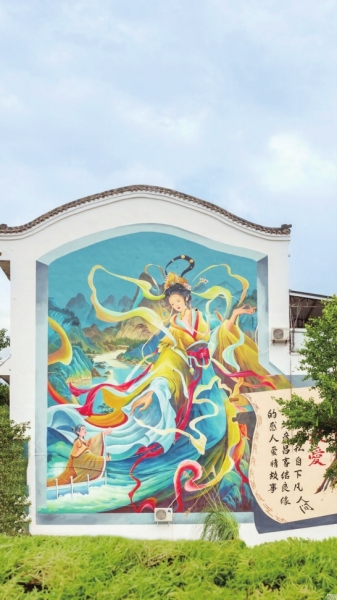 沿著沉山路繼續(xù)往前走,白墻青瓦的民居建筑側(cè)面與后墻,繪制著一幅幅栩栩如生的彩繪,有形神俱備的神話故事,有深邃澄碧的天空,有嬌艷妖嬈的桃花……生動(dòng)逼真的人物神態(tài)、鮮艷熱烈的“多巴胺”色彩,巧妙地將建筑外立面窗戶、空調(diào)外機(jī)、屋頂?shù)热谌氘嬛?,一切顯得自然流暢。