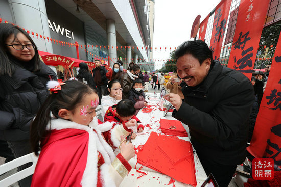 其中,手工剪紙最受市民青睞。“謝爺爺,我想剪個(gè)‘福’字。”“是不是這樣對(duì)折紙張呢?”“這一剪,是朝著尖頭處的方向嗎?”被一群小朋友簇?fù)碇钠轿浼艏埛沁z傳承人謝成飛告訴記者:“看到這么多人喜歡剪紙,喜歡我們中國(guó)的傳統(tǒng)藝術(shù),我非常開心。希望我們老祖宗留下的這些寶貝,世世代代地傳承下去。”