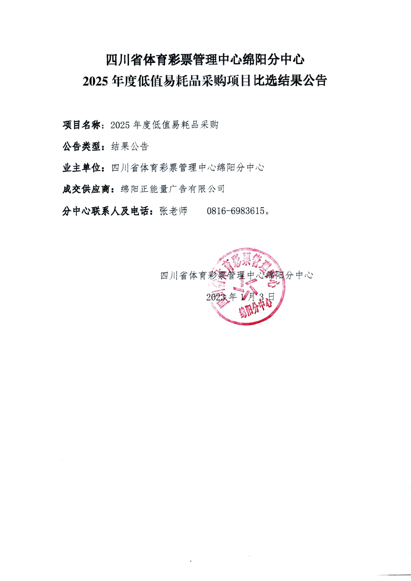 四川省體育彩票管理中心綿陽(yáng)分中心2025年度低值易耗品采購(gòu)項(xiàng)日比選結(jié)果公告