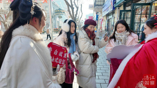 “天生我材必有用,千金散盡還復(fù)來。”“黃河遠(yuǎn)上白云間,一片孤城萬仞山。”……她們在哈爾濱的街頭發(fā)出“詩詞接龍”挑戰(zhàn),激起過往游客極大興趣,絕大多數(shù)參與者都順利應(yīng)戰(zhàn),并贏取了李白特色文創(chuàng)紀(jì)念品。