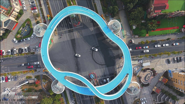 遠遠望去,天橋外形似一個不規(guī)則的圓環(huán),圓環(huán)上有雙層“科技藍”走道,地面鋪裝了兼顧防滑和耐磨的新型材料。