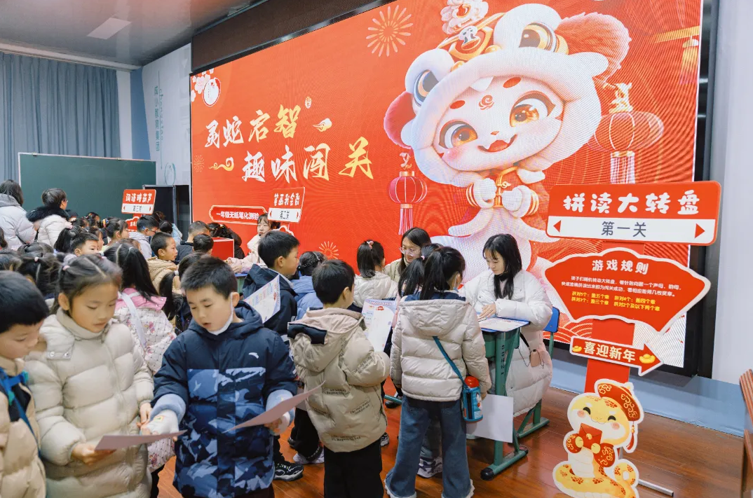 語文主場上,整齊排列在“拼讀大轉(zhuǎn)盤”處的孩子們揮舞著小手,靈活地轉(zhuǎn)動著大轉(zhuǎn)盤,看著指針指向的地方快速熟練地拼讀出聲母和韻母;“筆畫我會數(shù)”這一關(guān),大家滿懷期待地從盲盒中抽取字卡,接著大膽自信地數(shù)出生字筆畫;“詞語糖葫蘆”給孩子們準備了精美的“糖葫蘆詞語串”,闖關(guān)的“勇士”們隨機抽取一串糖葫蘆,準確地認讀葫蘆上的詞語,闖關(guān)成功后的印章可比糖葫蘆還要甜蜜;另一關(guān),孩子們化身神奇的小小魔法師,親自開啟“魔法書”,聲情并茂地背誦書中的兒歌課文咒語。幾個關(guān)卡有效檢驗了學生對本學期語文知識的掌握程度。