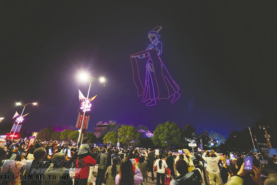 羌年當(dāng)天,游客在北川看無人機(jī)表演。