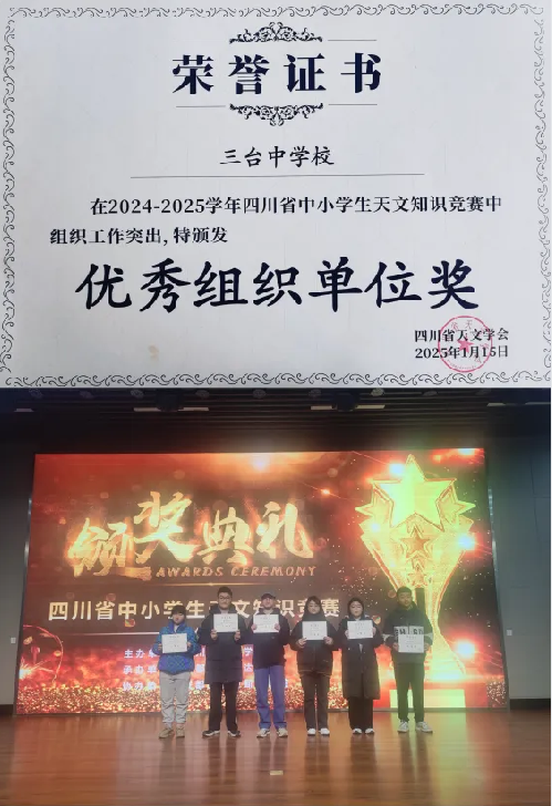 2025年1月19日,四川省中小學生天文知識競賽頒獎儀式在成都舉行。三臺中學12名師生榮獲省級獎勵,學校榮獲優(yōu)秀組織單位獎。