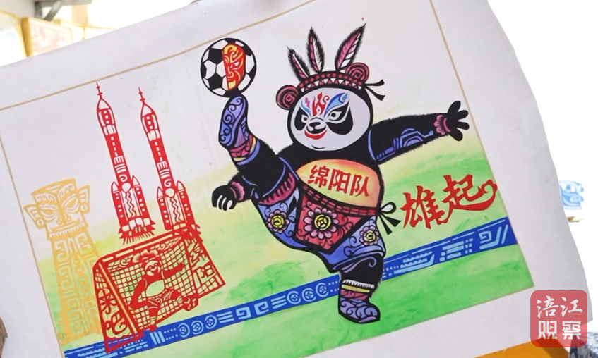“你看,這個熊貓川超娃娃正在完成足球賽事中經(jīng)典的倒掛金鉤動作。”蘭小奇指著作品中的熊貓形象介紹,“它頭戴白馬藏族頭飾、身著羌族服飾,既體現(xiàn)四川多民族特色,又暗含‘足球無界’的寓意。背景里,火箭圖案代表綿陽科技城,青銅面具元素象征三星堆文化,‘綿陽來吧’的書法字樣則是向八方來客發(fā)出的邀請。”