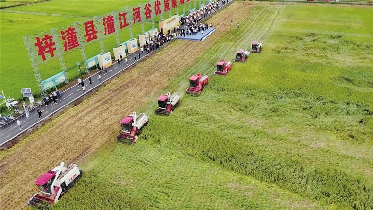 在梓潼潼江河谷優(yōu)質(zhì)糧油現(xiàn)代農(nóng)業(yè)園區(qū),聯(lián)合收割機在稻田里來回穿梭,切割、脫粒、篩選等工序一氣呵成。