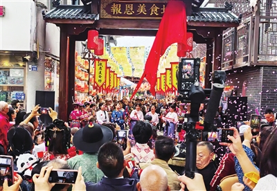 長(zhǎng)假首日,該縣新打造的報(bào)恩美食坊文化街區(qū)盛大開(kāi)街。紅綢高懸的牌坊下,白馬姑娘盛裝歌舞迎賓;青石板路上,“貨郎NPC”派發(fā)仿古銀票,六大主題打卡點(diǎn)人流如織。時(shí)值“川超”賽事,街區(qū)巧妙設(shè)置“第二觀賽點(diǎn)”,通過(guò)賽事直播、消費(fèi)券發(fā)放、有獎(jiǎng)競(jìng)猜等環(huán)節(jié),將賽場(chǎng)激情與市井煙火氣完美融合。