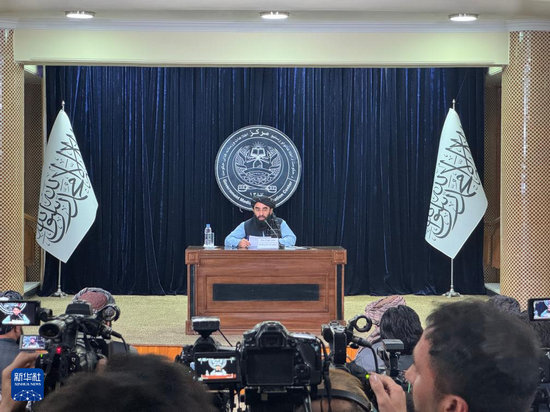 10月12日,阿富汗政府發(fā)言人扎比烏拉·穆賈希德在首都喀布爾舉行的記者會(huì)上發(fā)言。
