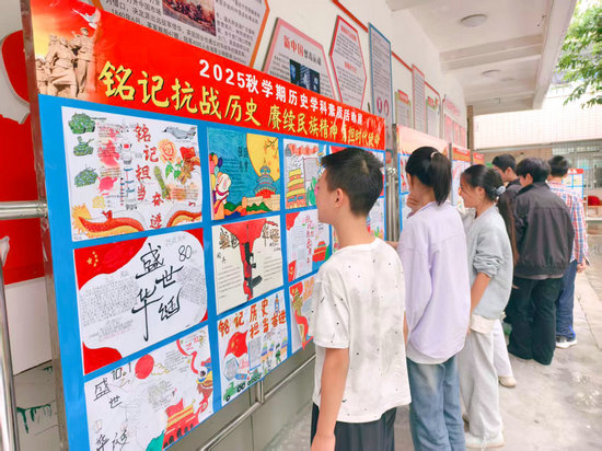 作品完成后,歷史組老師們利用休息時間,對優(yōu)秀作品進(jìn)行了篩選和整理,并精心設(shè)計(jì)、布置了專題展板。展板一經(jīng)展出便吸引了眾多師生駐足觀看。課間時分,同學(xué)們或凝神細(xì)讀,或低聲交流,在一筆一畫、一文一圖中感受歷史的厚重與民族的堅(jiān)韌。這道獨(dú)特的“風(fēng)景線”,不僅美化了校園環(huán)境,更營造了“時時受教育,處處受熏陶”的濃厚學(xué)習(xí)氛圍,讓歷史知識“活”了起來,讓民族精神“立”了起來。