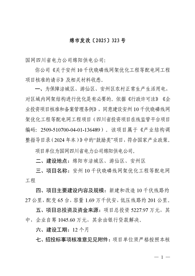 綿陽(yáng)市發(fā)展和改革委員會(huì)關(guān)于安州10千伏曉磷線網(wǎng)架優(yōu)化工程等配電網(wǎng)工程項(xiàng)目核準(zhǔn)的批復(fù)