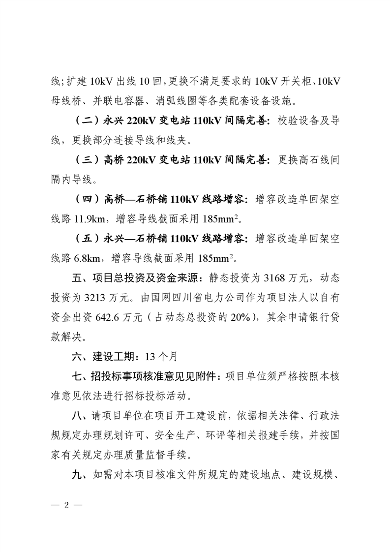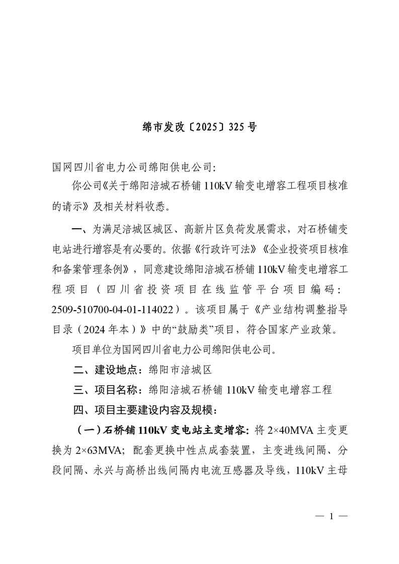 綿陽市發(fā)展和改革委員會關于綿陽涪城石橋鋪110kV輸變電增容工程項目核準的批復