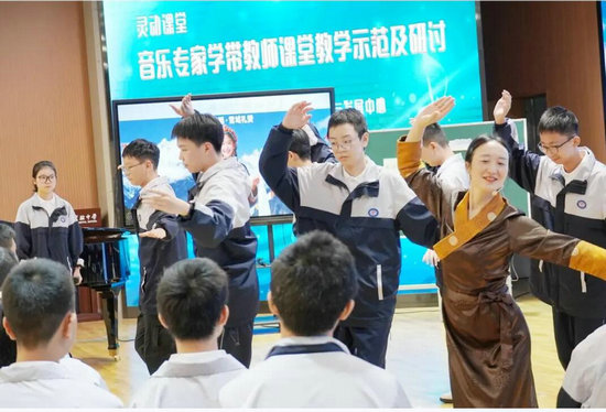 第一節(jié)示范課堂——沉浸雪域,解碼天籟之秘。涪城區(qū)音樂(lè)學(xué)帶教師、綿陽(yáng)市實(shí)驗(yàn)中學(xué)何江濤老師執(zhí)教《雪域天音——弦子、囊瑪與堆諧》。何老師以藏族歌舞為主線,運(yùn)用沉浸式教學(xué)策略,通過(guò)講述文成公主歷史故事、介紹扎木聶樂(lè)器、融合傳統(tǒng)歌舞與現(xiàn)代創(chuàng)編舞蹈《起舞吧·拉薩》等手段,引導(dǎo)學(xué)生將歌聲、節(jié)奏與舞步融為一體,實(shí)現(xiàn)了文化浸潤(rùn)與審美融合的深度教學(xué),展現(xiàn)了該校在民族音樂(lè)教學(xué)上的探索成果。