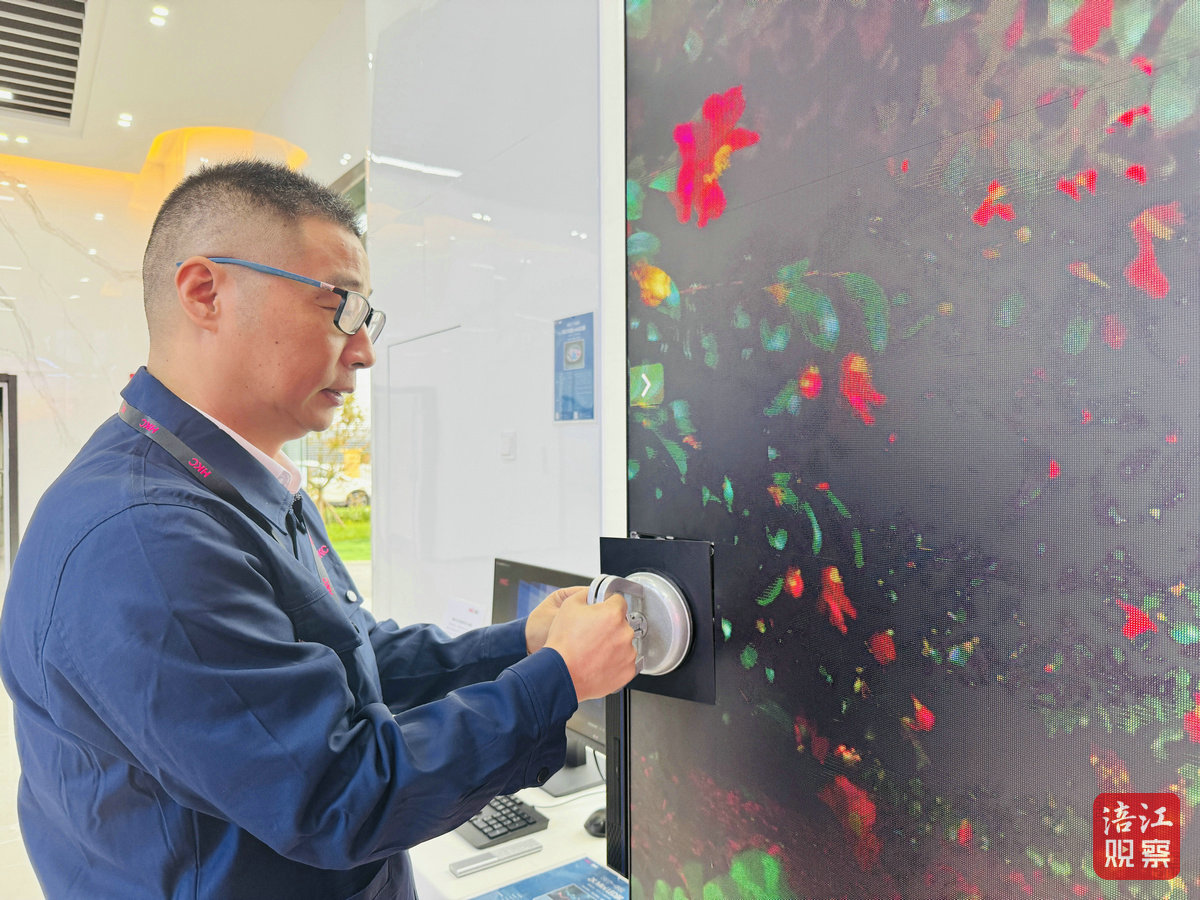一樓的展廳內(nèi),136寸的一體機更是引人注目。“這是由無數(shù)塊8寸的Mini-LED模塊組成,采用獨特的前維護(hù)設(shè)計,就像拼樂高一樣,哪塊壞了,直接用專業(yè)吸盤工具取下來更換即可,大大降低了維護(hù)成本和時間。”蔡遠(yuǎn)橋介紹,讓這項高技術(shù)工藝變得直觀可感。