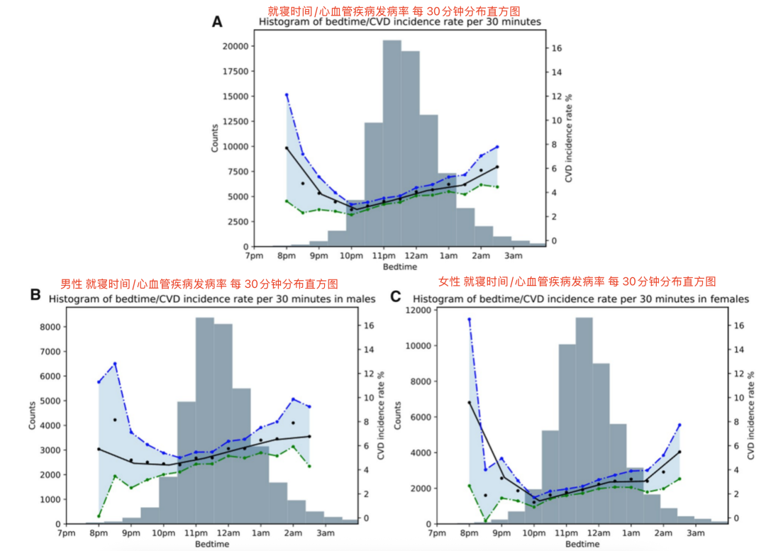 睡眠開始時間與心血管疾病發(fā)病率之間的關(guān)系,(A)總體樣本,(B)男性,(C)女性,圖源:參考文獻(xiàn) [1]