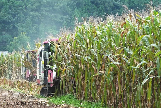 近日,在梓潼縣文昌鎮(zhèn)龍口村,一臺臺履帶式收割機在玉米地里來回穿梭。玉米稈整齊卷入,在剝?nèi)ビ衩姿氲陌~后,再通過脫粒裝置分離金黃的籽粒與穗軸,最后將籽粒篩選干凈,順著管道涌入隨行的運輸車,再拉到烘干房烘干。秸稈則被粉碎切割成細碎的草屑,均勻地撒向田間,化作滋養(yǎng)土地的天然肥料。