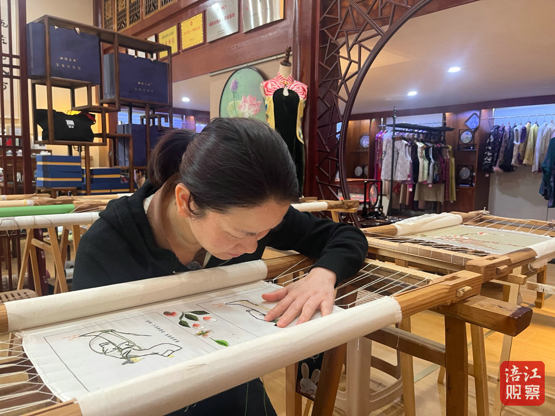 繡架前,學員陳建蓉的身影格外引人注目。她的右眼失明,左眼視力僅0.1,因此她需要將臉貼近繡布才能辨識針腳。但就在這樣的狀態(tài)下,“李白舉杯邀明月”的詩意畫卷一針一線地緩緩呈現(xiàn)。