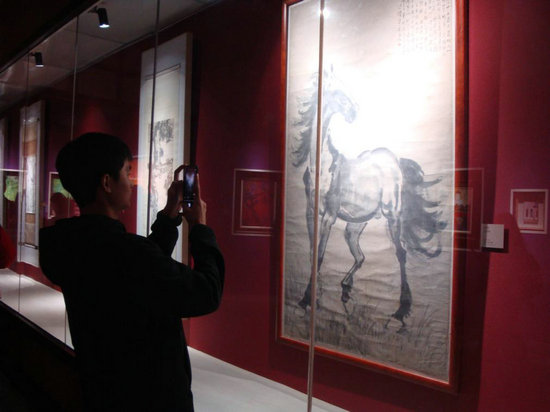 10月23日,觀眾在成都寶光寺拍攝徐悲鴻畫作。新華社記者 康錦謙 攝
