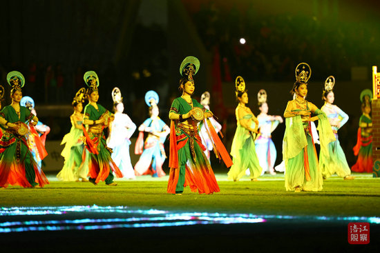 緊接著,體現(xiàn)綿陽和廣元?dú)v史文化元素的大型古風(fēng)融合秀《郪風(fēng)唐韻》唯美來襲。380余名表演者隨歌而舞,衣袂翩躚,伴隨著大型立鼓敲響,2只飛天鳳凰繞場飛翔助陣將現(xiàn)場氣氛推向了高潮。