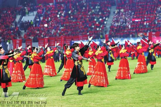 從開場表演《郪風(fēng)唐韻》,“鳳凰于飛”燈光秀光影流轉(zhuǎn),鳳翼翩然,到充滿青春氣息的團體操,兩地文化符號輪番上演,將古風(fēng)古韻與團結(jié)熱烈的氛圍拉滿。