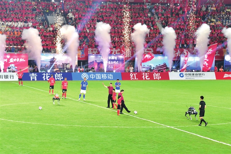 其一,“在地性”極強。舉個例子,10月7日的川超綿陽主場開幕式上,開球嘉賓搭乘的無人駕駛公交車、現(xiàn)場迎賓的長虹機器人、裝載比賽用球的“機器狼”,均出自綿陽本地企業(yè)或本地科研成果。很顯然,這種本地化科技裝備與紅色文化、體育競技的結(jié)合,既避免了“外來科技”的違和感,又進一步彰顯了“科技城”的定位,由此帶給游客和市民的獨特體驗感,是一般城市所無法比擬的。