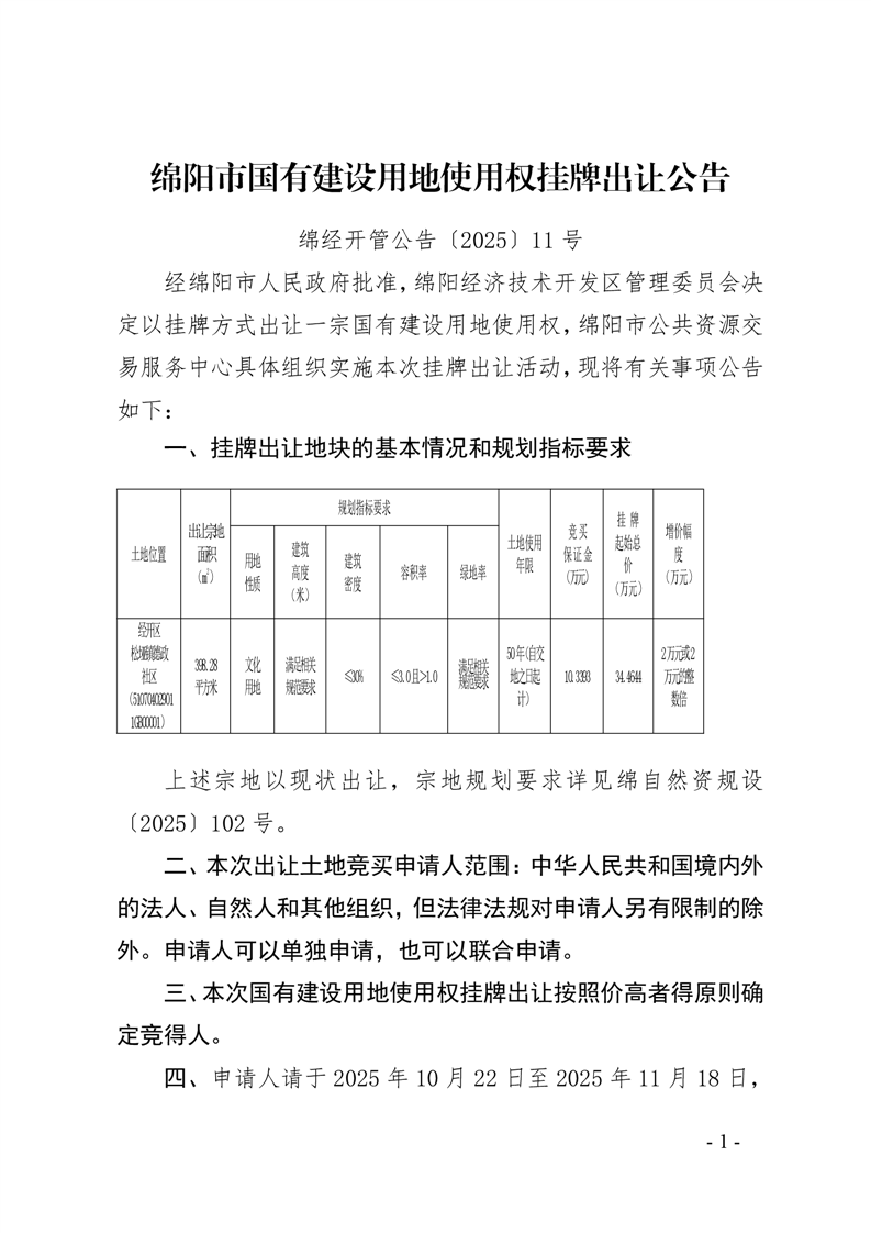 綿陽市國有建設(shè)用地使用權(quán)掛牌出讓公告(綿經(jīng)開管公告〔2025〕11號)