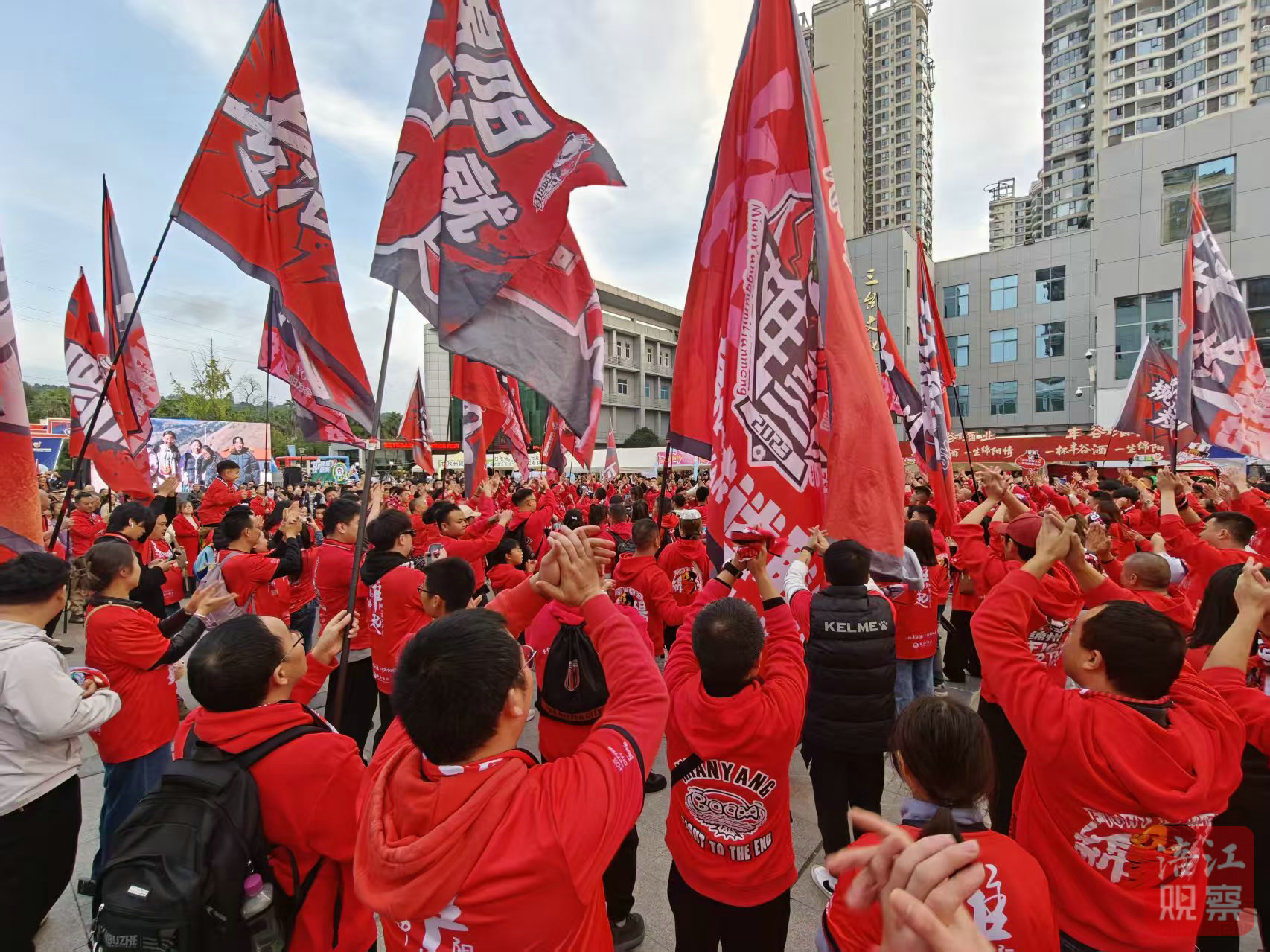 “綿陽雄起!”身著統(tǒng)一紅色戰(zhàn)袍的綿陽球迷,手持鮮艷的“戰(zhàn)旗”,早早地匯聚在三臺(tái)縣體育場(chǎng)外。他們喊出響亮的口號(hào),用激昂的歌聲和此起彼伏的歡呼聲,點(diǎn)燃現(xiàn)場(chǎng)的氣氛。