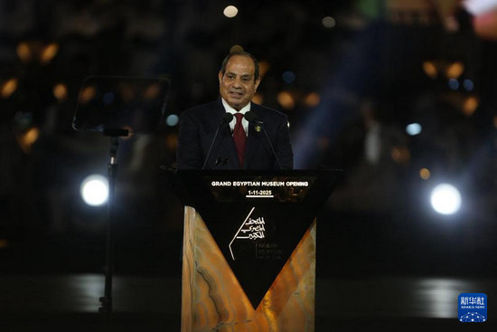 11月1日,在埃及吉薩,埃及總統(tǒng)塞西在開(kāi)館儀式上致辭。