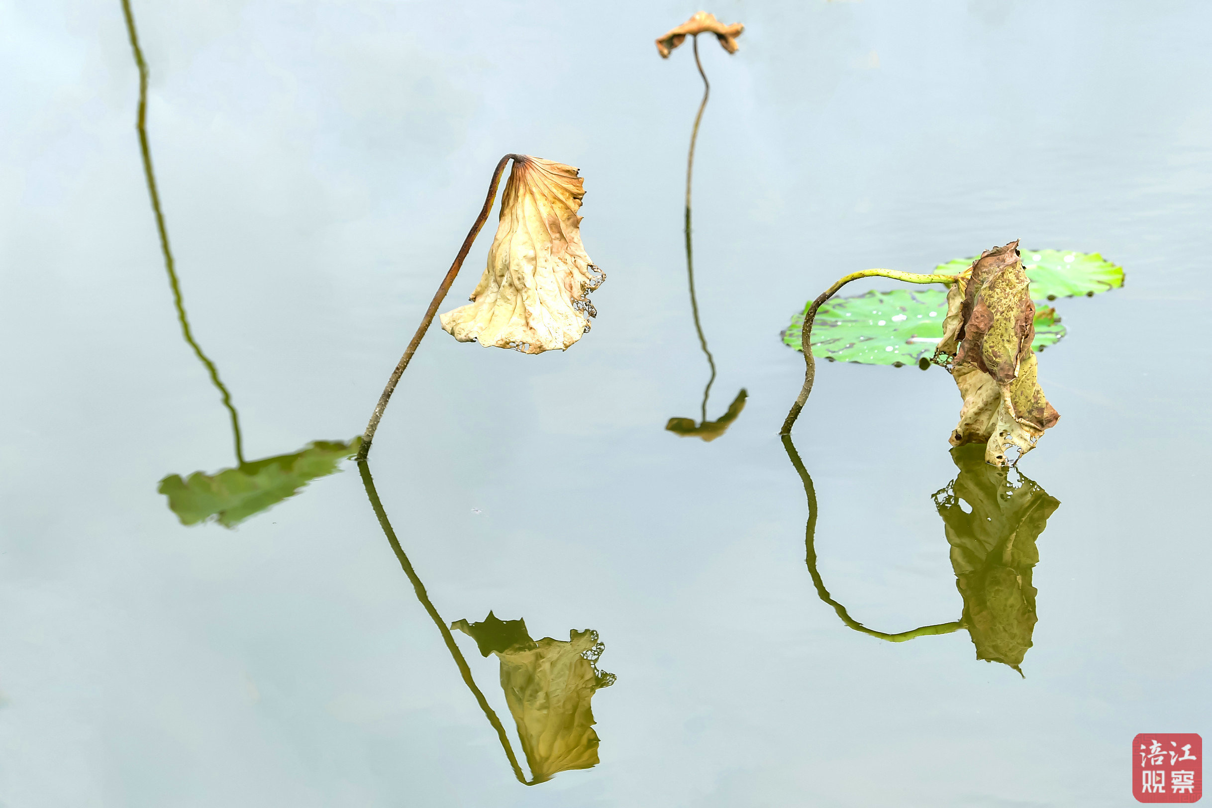 荷塘中,斜倚的莖稈倒映水面,宛如疏朗的線條,交織出簡(jiǎn)潔的幾何之美。