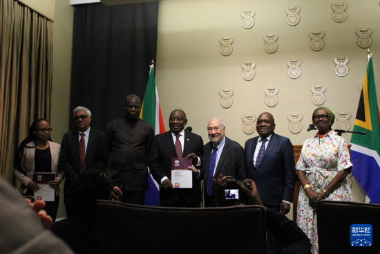 11月4日,在南非立法首都開普敦,二十國集團(tuán)應(yīng)對(duì)全球不平等問題特別獨(dú)立專家委員會(huì)主席、諾貝爾經(jīng)濟(jì)學(xué)獎(jiǎng)得主約瑟夫·施蒂格利茨(右三)和專家委員會(huì)成員向南非總統(tǒng)拉馬福薩(右四)提交關(guān)于全球不平等問題的報(bào)告。新華社發(fā)(沙姬拉·泰比攝)