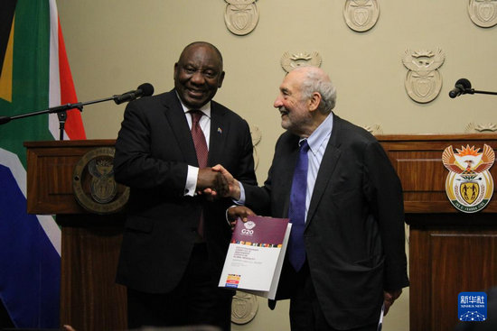 11月4日,在南非立法首都開普敦,二十國集團(tuán)應(yīng)對(duì)全球不平等問題特別獨(dú)立專家委員會(huì)主席、諾貝爾經(jīng)濟(jì)學(xué)獎(jiǎng)得主約瑟夫·施蒂格利茨(右)向南非總統(tǒng)拉馬福薩提交關(guān)于全球不平等問題的報(bào)告。新華社發(fā)(沙姬拉·泰比攝)