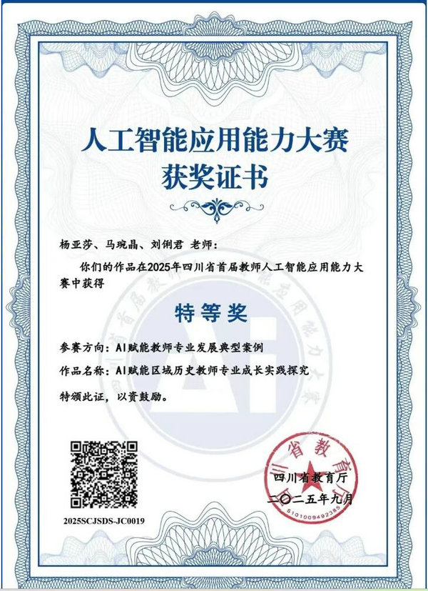 在四川省首屆教師人工智能應(yīng)用能力大賽中,馬琬晶、劉俐君老師以AI賦能歷史教學(xué)為核心,有效破解了傳統(tǒng)課堂痛點,榮獲特等獎。