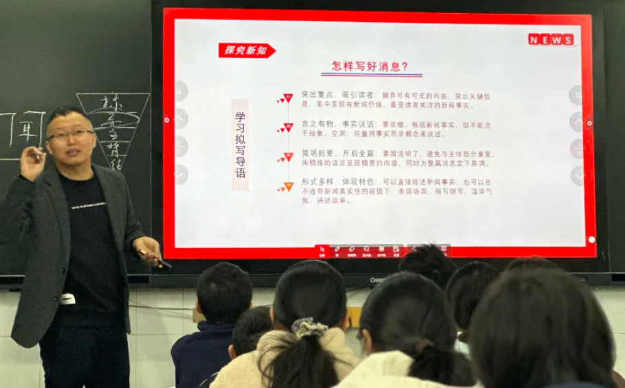 趙亮老師在八年級三班呈現(xiàn)了一堂結(jié)構(gòu)嚴謹、內(nèi)容充實的《新聞寫作》示范課。課堂環(huán)節(jié)緊湊,知識點層層遞進,學生積極參與討論,踴躍回答問題。現(xiàn)場采訪聽課教師環(huán)節(jié)氣氛熱烈而有序,學生新聞寫作成果豐富多樣,佳作頻出,充分體現(xiàn)了學以致用的教學效果。