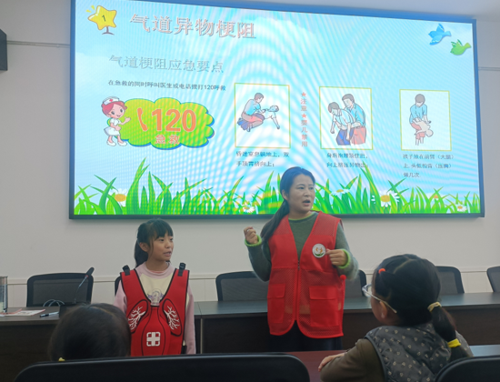 在講授環(huán)節(jié),老師用課件, 動畫短片講授“氣道異物梗阻”“溺水”“中暑”等日常場景風險,搭配朗朗上口的安全口訣,讓孩子快速記憶。