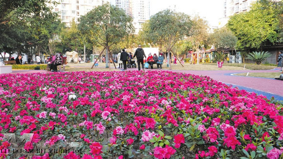 恒昌路口袋公園是該縣口袋公園建設(shè)的典型代表。該公園總面積約3700平方米,總投資140萬元,按照喬灌花草相結(jié)合的原則,用叢生多頭藍(lán)花楹、大型叢生垂絲海棠等異形喬木,結(jié)合組團(tuán)花境組成觀賞性較高的綠化景觀,同時鋪裝草皮、安裝汀步、添置休閑座椅,供市民休閑游賞。