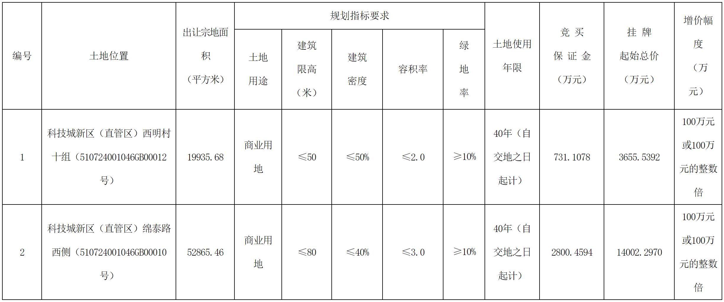 經(jīng)綿陽市人民政府批準,綿陽科技城新區(qū)管理委員會決定以掛牌方式出讓兩宗國有建設(shè)用地使用權(quán),綿陽市公共資源交易服務(wù)中心具體組織實施本次掛牌出讓活動,現(xiàn)將有關(guān)事項公告如下: