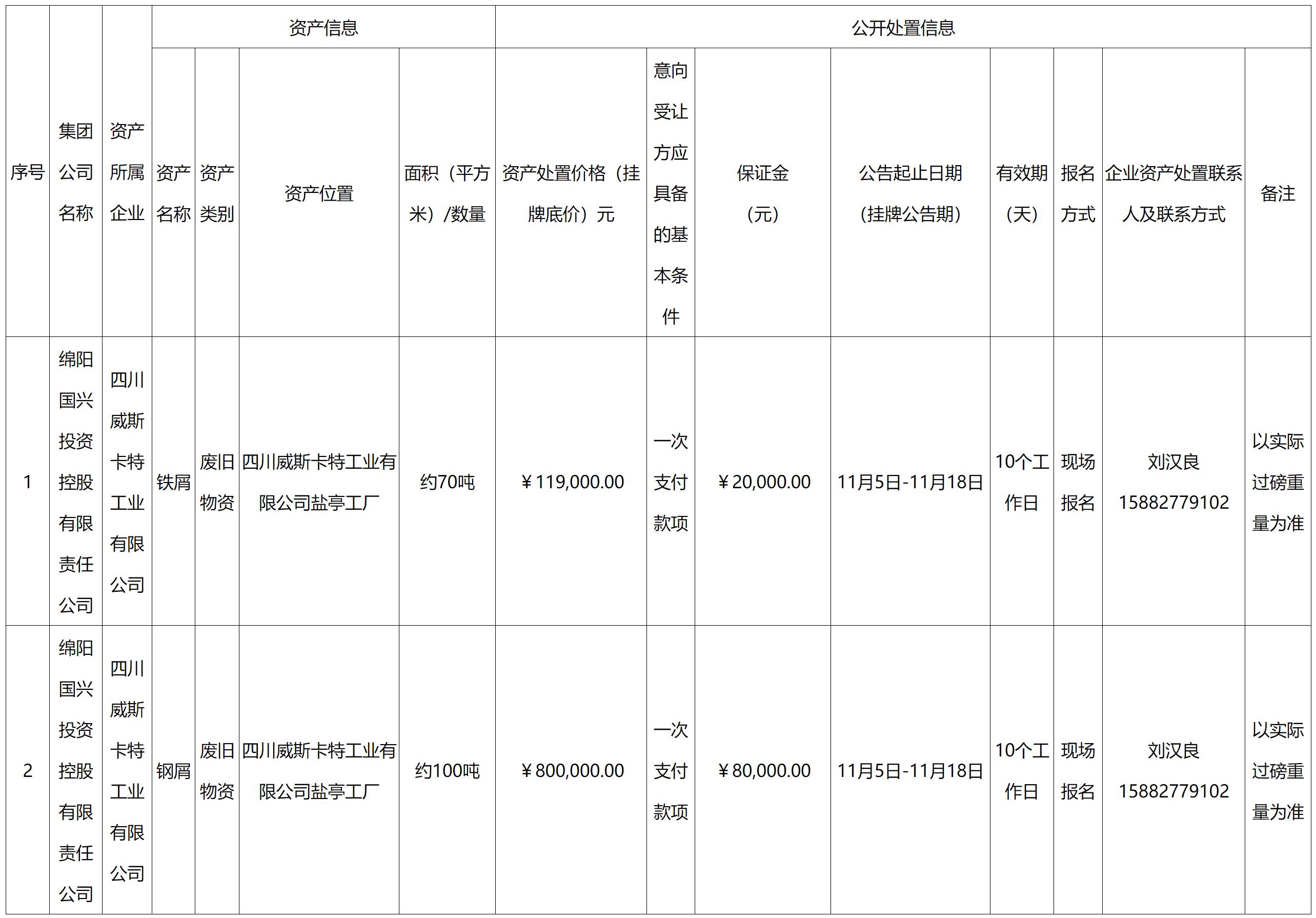 綿陽國興投資控股有限責(zé)任公司資產(chǎn)處置公告