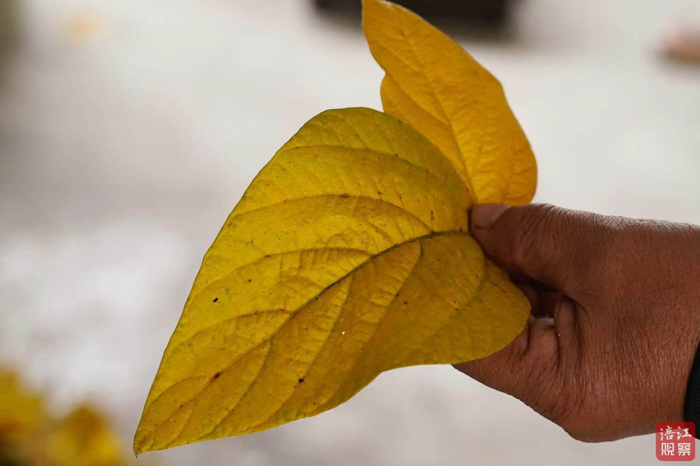 劉從林說:“采摘技術不難,只要沒有蟲眼就行。像這種有蟲眼的就不能要,要選黃色的、沒有病斑的。葉子黃了就可以摘,一天摘50斤完全沒問題。”
