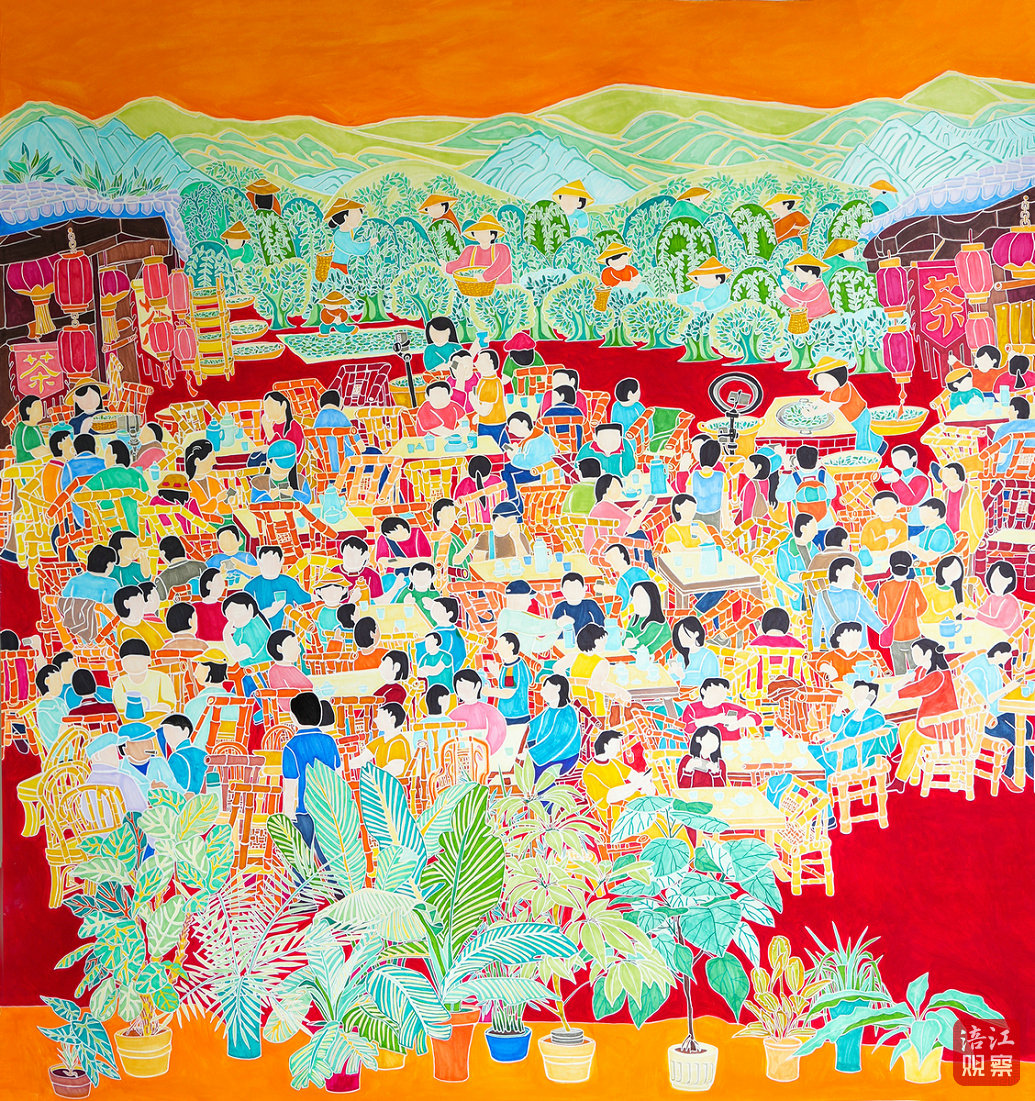 楊若雪的《茶香傳薪新·享茶品豐饒》構(gòu)圖以幾何化梯田、圓桌茶宴構(gòu)建秩序感,夸張變形的人物輪廓與茶樹形態(tài)釋放情感張力,形成“拙中藏巧”的視覺語(yǔ)言。作品畫面中,前幅呈現(xiàn)茶農(nóng)古法采茶、曬青、炒制,與網(wǎng)絡(luò)直播賣茶光影交織,傳統(tǒng)技藝與數(shù)字浪潮在茶香中對(duì)話;后幅游客圍坐茶宴,笑語(yǔ)隨茶湯漾開,品茗升華為鄉(xiāng)村美學(xué)儀式。作品以“薪火”續(xù)文化基因,以“豐饒”繪產(chǎn)業(yè)圖景,在鄉(xiāng)土煙火中熔鑄時(shí)代精神。觀者既見茶山律動(dòng),亦品振興史詩(shī)。