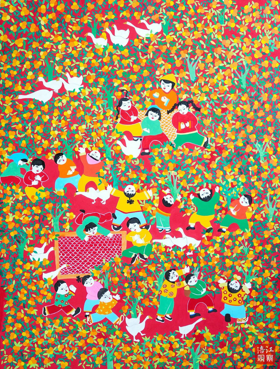 陳維兵的《幸福果農(nóng)》源于鄉(xiāng)村生活,描繪了勞動(dòng)情景和幸福生活的景象,通過(guò)夸張的造型和濃烈的色彩,生動(dòng)刻畫村民協(xié)作勞動(dòng)的場(chǎng)景。作品畫面風(fēng)格吉祥喜慶,表現(xiàn)了老百姓樂(lè)觀向上的生活追求和審美情趣。作品畫面色彩絢麗濃烈,裝飾平和自然,線條簡(jiǎn)練,凸顯農(nóng)民畫質(zhì)樸奔放的藝術(shù)特色,表現(xiàn)了老百姓對(duì)美好生活的向往以及對(duì)真善美的渴望與追求。