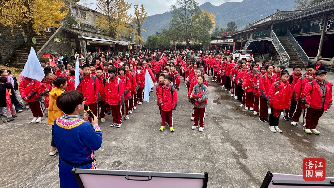 12日上午10時,景區(qū)入口處已人頭攢動,散客與研學(xué)團(tuán)隊共同構(gòu)成一幅熱鬧的秋假出游畫卷。中午時分,來自成都市武侯區(qū)領(lǐng)川外國語學(xué)校的380名學(xué)生統(tǒng)一著裝,抵達(dá)景區(qū)開展以“探秘羌寨古韻·傳承非遺文脈”為主題的秋季研學(xué)實踐。