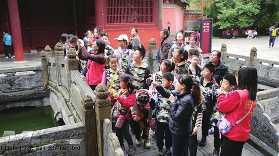 學生走進北川九皇山景區(qū)參觀游覽。