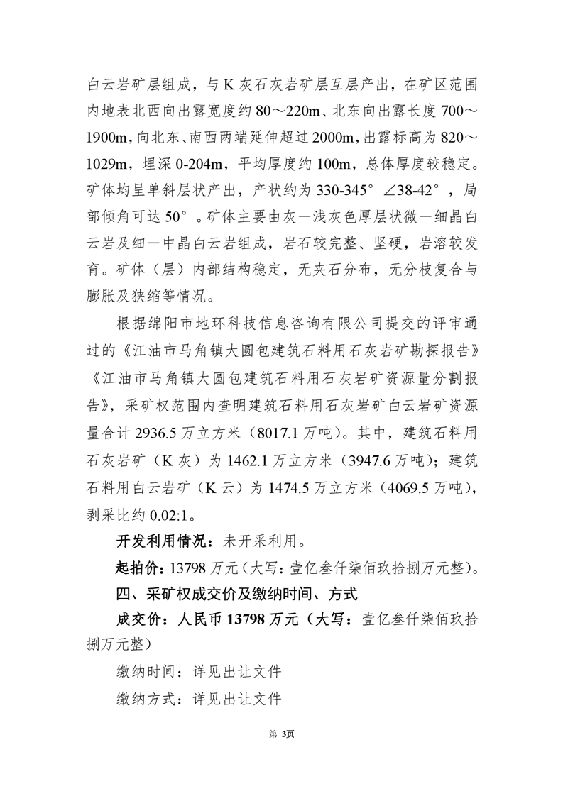 江油市馬角鎮(zhèn)大圓包建筑石料用白云巖石灰?guī)r礦采礦權(quán)拍賣出讓成交結(jié)果公示(綿礦招拍掛〔2025〕6號)
