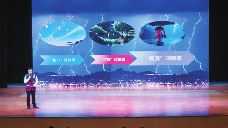 參賽選手講解雷暴哮喘的預(yù)防方法?!∮浾?楊方彧 攝