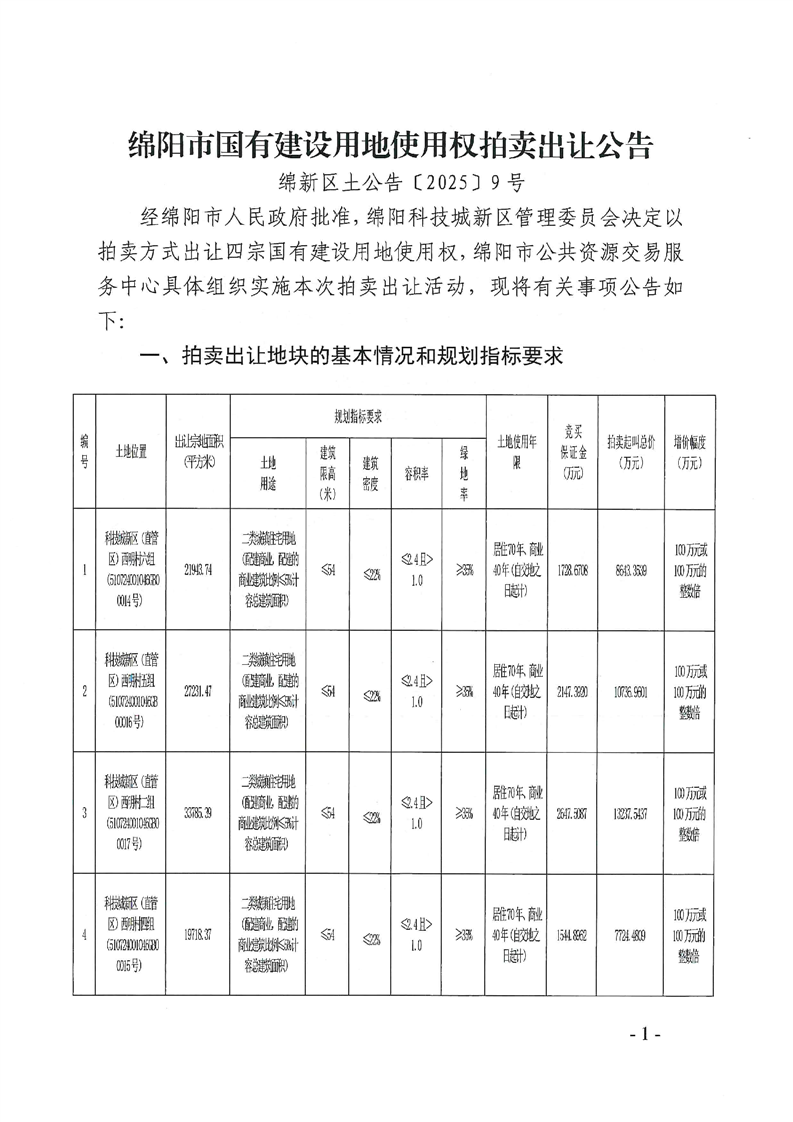 綿陽市國有建設用地使用權拍賣出讓公告(綿新區(qū)土公告〔2025〕9號)