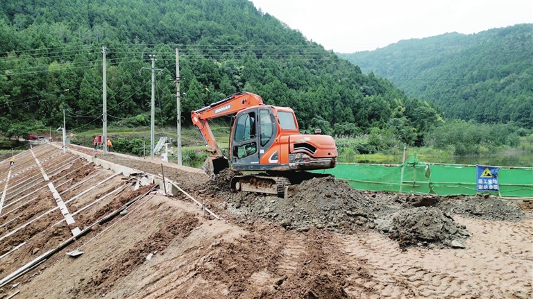 挖掘機開展壩體加固作業(yè)。記者 彭紫薇 攝