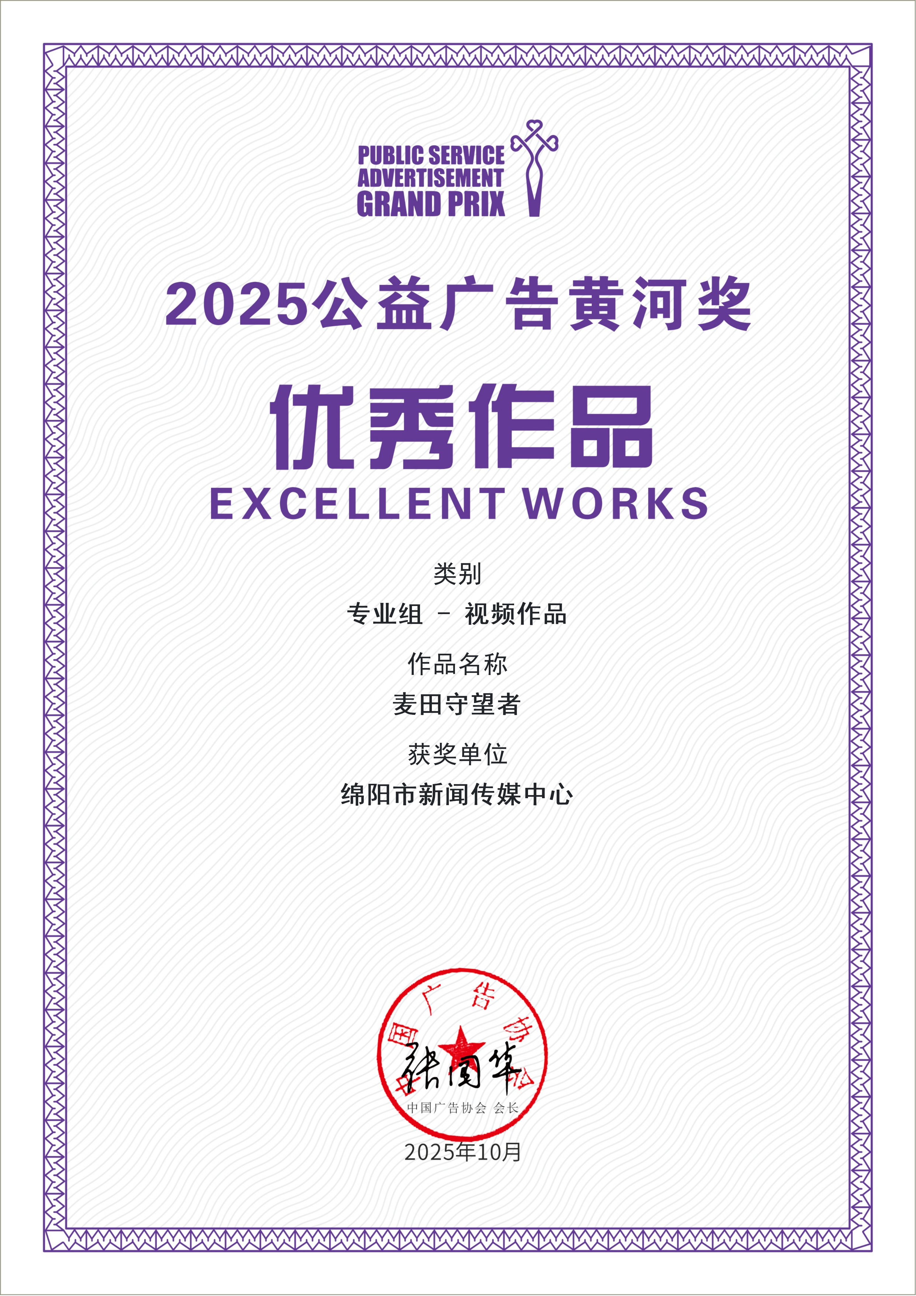 近日,2025公益廣告黃河獎頒獎典禮在青島舉行。由綿陽市新聞傳媒中心“益心向陽”公益廣告工作室創(chuàng)作的公益廣告短片《麥田守望者》榮獲專業(yè)組優(yōu)秀作品獎,標志著綿陽市新聞傳媒中心在公益廣告創(chuàng)作與傳播領(lǐng)域邁上新臺階。