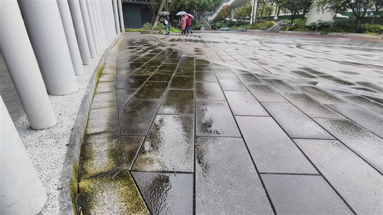 近日,一場雨后,記者實地探訪發(fā)現(xiàn),該處廣場廊架下的地磚表面附著明顯青苔,雨水浸潤后更顯濕滑,多位市民向記者反映:“幾乎每天都有人在這里摔倒。”